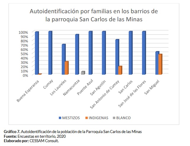 En el Gráfico 7, se puede observar que en la parroquia San Carlos de las Minas el grupo étnico de mayor presencia es el mestizo con un porcentaje del 100% en los barrios: Cumay, Puente Azul, San Agustín, San Carlos y San José de las Flores. En los barrios Los Laureles, San Antonio de Cumay y San Miguel, se puede observar un porcentaje considerable que se autoidentifican indígenas. Finalmente, en el barrio Namacuntza, se muestra que el 7% se autoidentifican blancos