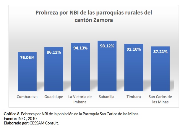 Según la imagen, se puede observar que las 6 parroquias rurales del cantón Zamora, tienen un índice de pobreza elevado. En la parroquia San Carlos de las Minas el 87,21 % de la población es pobre. Lo que significa que, en la parroquia las necesidades básicas no han sido cubiertas. De acuerdo a la CEPAL las Necesidades Básicas Insatisfechas (NBI), están determinadas por cinco indicadores como son: capacidad económica, acceso a educación básica, acceso a vivienda, acceso a servicios básicos y hacinamiento