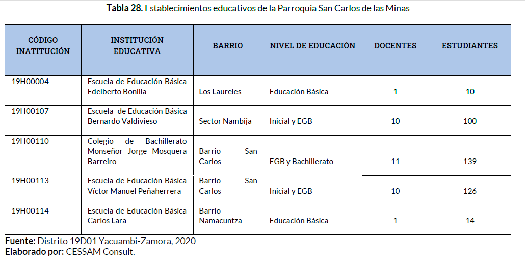 De acuerdo con el Nuevo Modelo de Gestión Educativa, implementado por parte del Ministerio de Educación a partir del 2010, el cual garantiza y asegurar el cumplimiento del derecho a la educación, influencia de manera directa sobre el acceso universal con equidad a una educación de calidad y calidez, atendiendo las realidades locales y culturales, no obstante, con esto la parroquia de San Carlos de las Minas muestra la siguiente información: