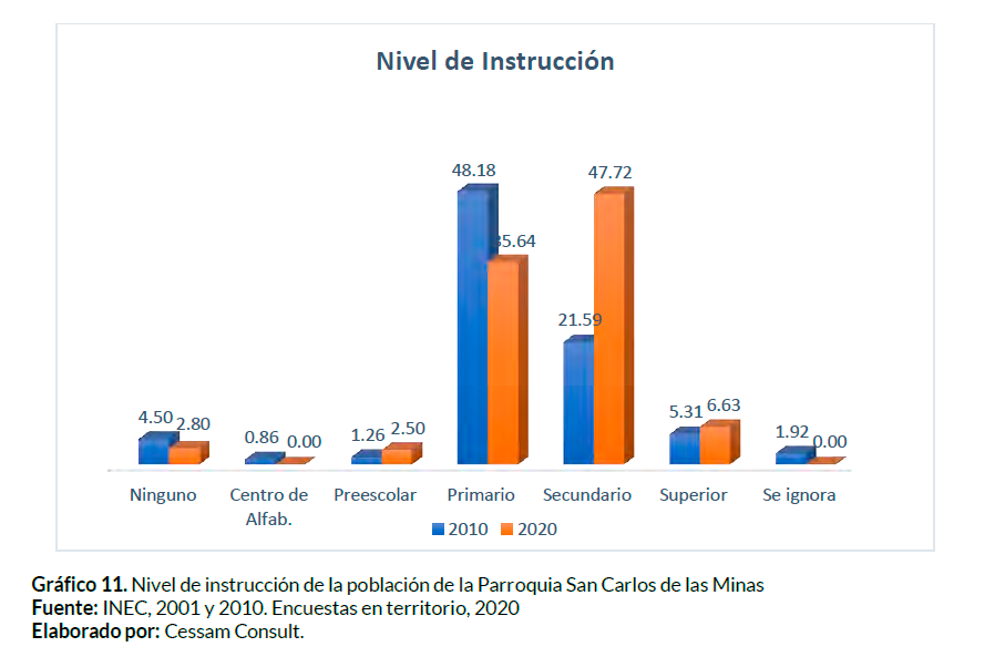 Según los datos del INEC 2010, los grados de escolaridad se consideran desde 0 (ninguno) hasta 18 años. Para mayor facilidad de análisis, se han agrupado en tres rangos de grados escolares, es así como se observa que el 52% de la población ha estudiado entre 1 y 6 años (1456 personas), siendo mayor la población. El 34% (952 persona), cuenta de 7 a 12 años de estudio y un pequeño porcentaje entre 13 y 18 años (11%). Finalmente, el 3% (84 personas), no cuentan con ningún año de estudio